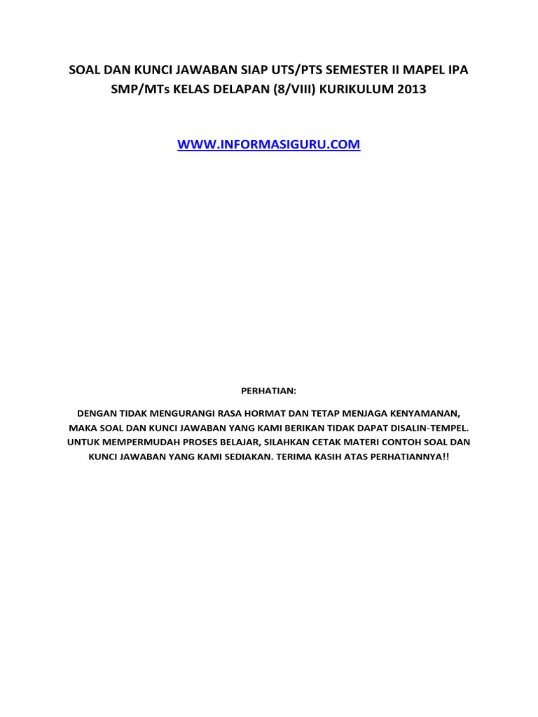 Soal uh ipa kelas 8 bab struktur dan fungsi tubuh tumbuhan semester 1.pdf. Penilaian tengah semester (pts) merupakan kegiatan evaluasi belajar, atau bisa juga disebut ulangan umum pada jeda semester. Berbagai jenis penilaian dilakukan untuk mengukur ketercapaian kompetensi, misalnya ulangan harian uh/ph dan ulangan tengah semester uts/pts. Bagi anda yang ingin mendownload soal uts/pts mata pelajaran ipa kelas 8 (viii) semester 2 kurikulum 2013 tahun pelajaran 2019/2020 silahkan demikianlah postingan soal ulangan tengah semester atau penilaian tengah semester 2 mata pelajaran ipa untuk jenjang sekolah menengah. Penilaian ini merupakan pemberian evaluasi terhadap keahlian. Ada yang tau nggak ipa kelas 8 halaman 31 32 nomor 1 10. Posisi awal kedua kaki yang benar saat persiapan untuk melakukan teknik dasar mengumpan atau menendang bola adalah …. Download soal dan kunci jawaban pts ipa kelas 8 semester 1 kurikulum 2013. Kegiatan penilaian tengah semester 1 ganjil ialah salah satu kegiatan penilaian hasil belajar peserta didik. Penilaian tengah semester merupakan salah satu bentuk penilaian hasil belajar peserta didik. Semoga postingan kali ini, bisa membantu proses belajar para peserta didik, dan juga bisa dijadikan salah satu referensi soal pts/uts di sekolah bapak/ibu guru. Penilaian tengah semester (pts) adalah kegiatan yang dilakukan oleh pendidik untuk mengukur pencapaian kompetensi peserta didik di tengah semester. Wajib diketahui guru mata p.